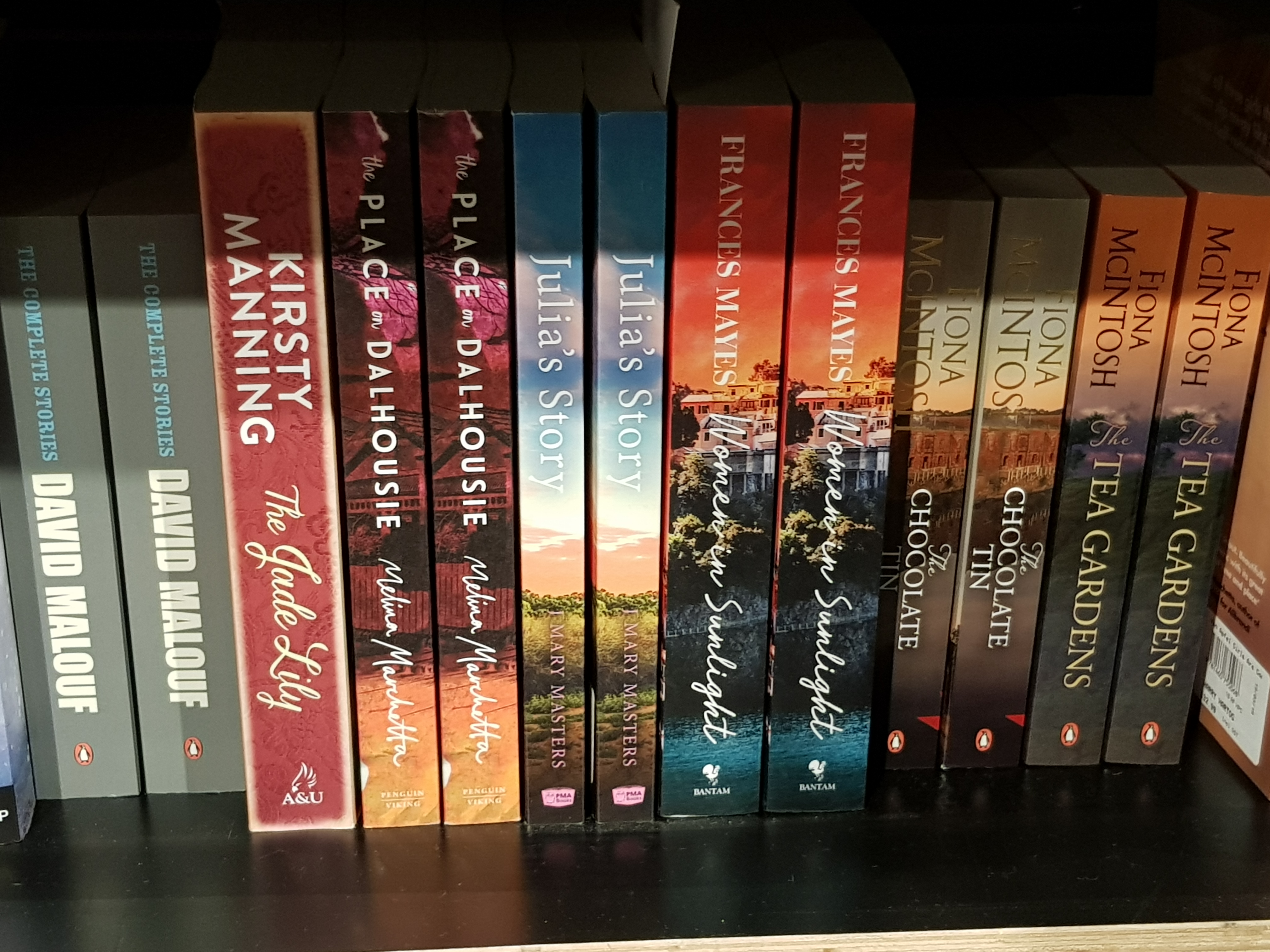 What do authors want to see? They want to see their books nestled on the shelf in a quality bookstore – in this case HARRY HARTOG BOOKSELLER in Maroochydore – alongside authors whose names they recognise – in my case, Melina Marchetta to the left and Frances Mayes to the right. Then comes Fiona McIntosh and back to the left, David Malouf.